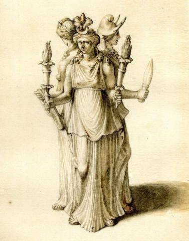 Ἑκάτη, Ekate, Hekate. The first epsilon, e takes daseia, which means that you have to pronounce half h. The last syllable is makrochrone, so it takes twice the time to pronounce the laste tee like tea. E-ka-te-e